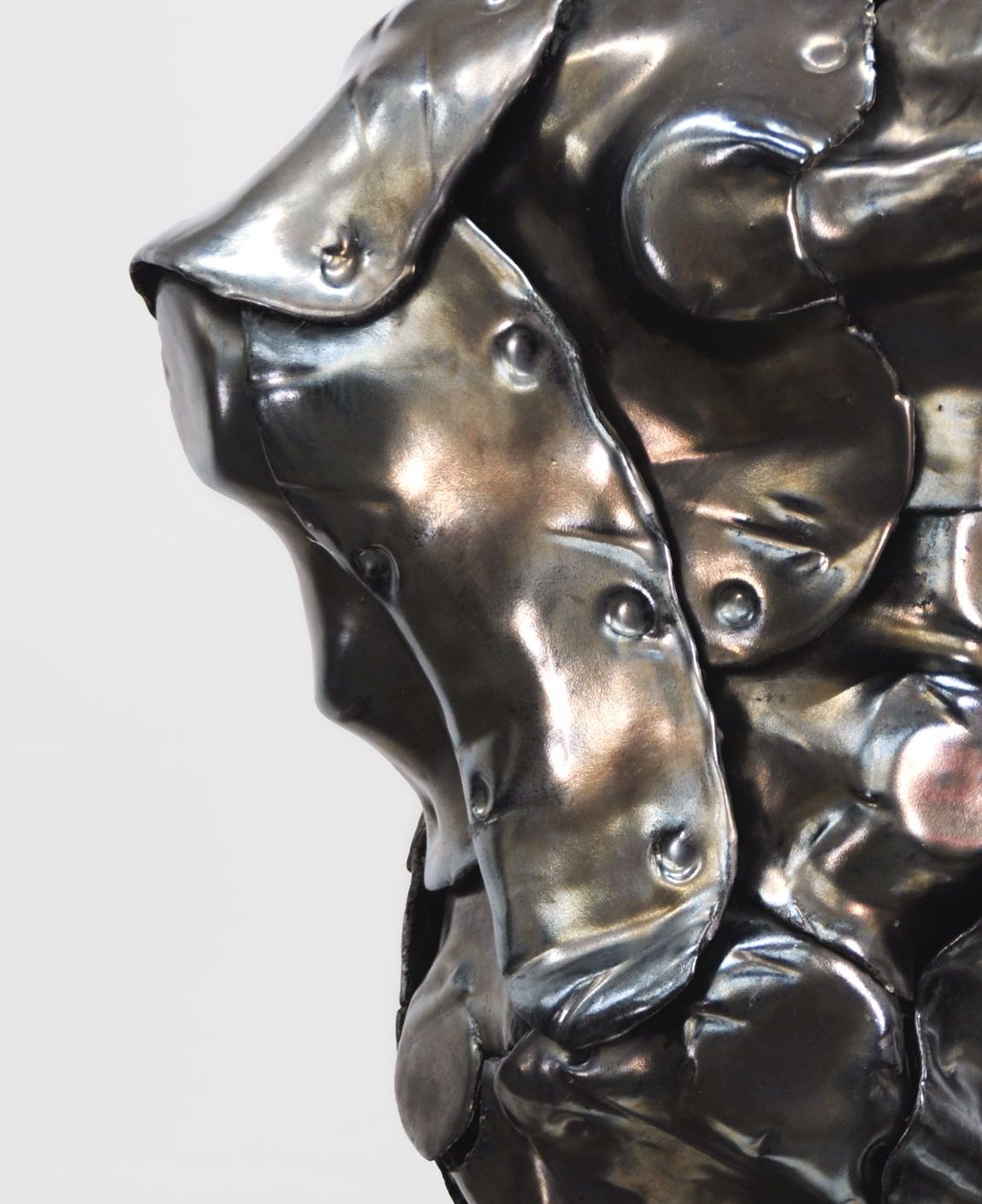 His works move between the organic world and industrial formal language. Through deliberate openings and cracks, the sculptor allows the imagination to explore the inner workings of his works without revealing them entirely.